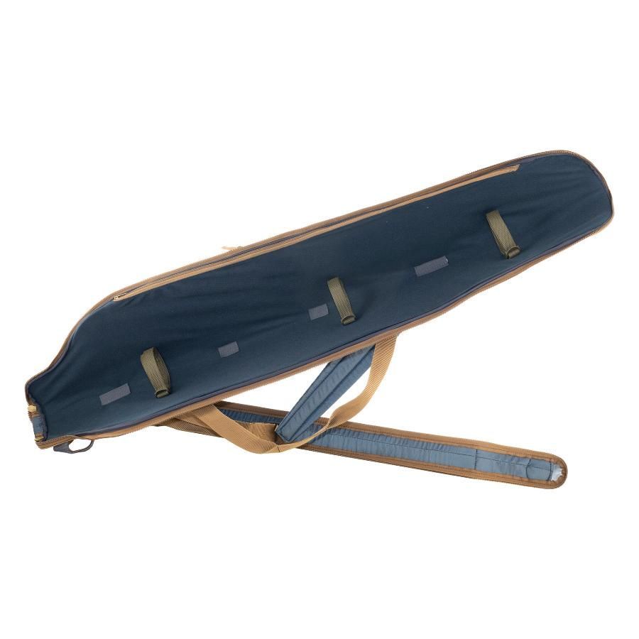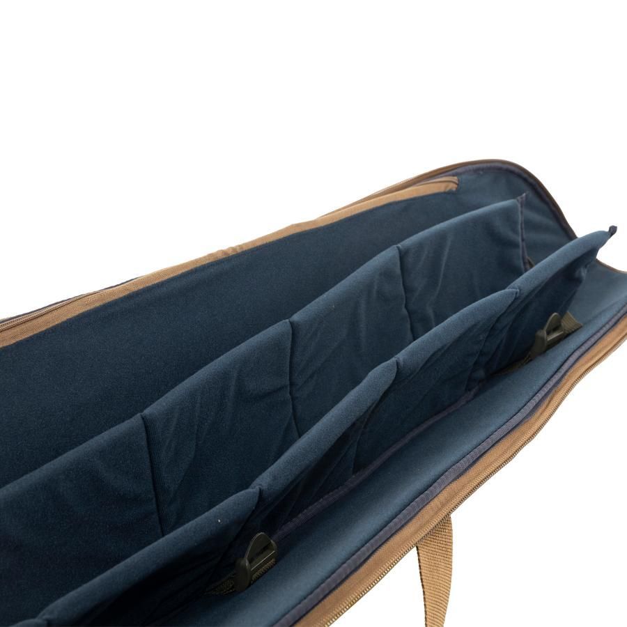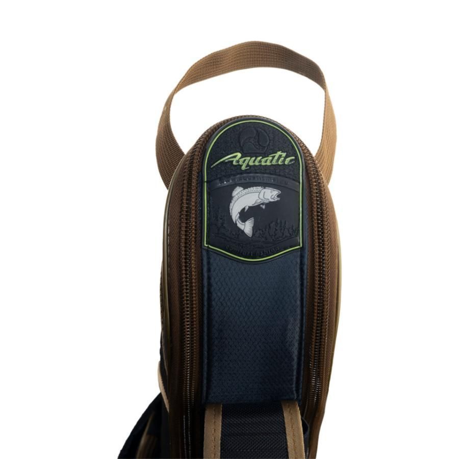 Снаружи расположен длинный карман для подсака или стоек и объемный карман на молнии для аксессуаров. В чехол помещается до 5 удилищ с катушками. Внутренняя часть выполнена из мягкого ворсистого материала на который крепятся специальные подушки для катушек.