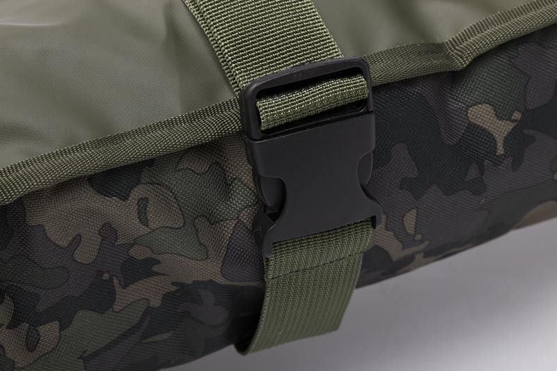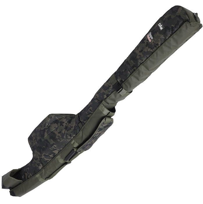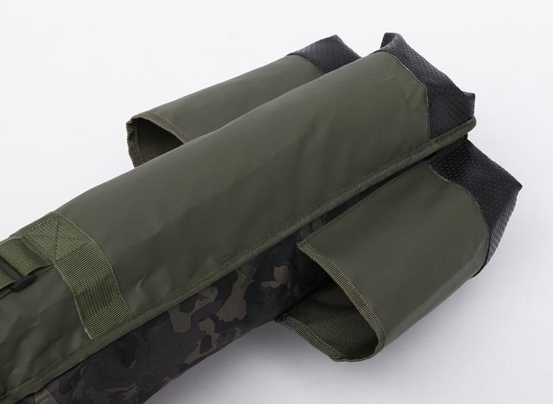 Чехол для трех 13 футовых карповых удилищ с мягкой подкладкой, изготовленная из оливково-зеленого полиэстера Polyester Camovision 600D. С каждой стороны, на нижнем торце, чашки для удилищ, подсачеков, стоек или зонтика, поддерживаемые регулируемыми ремнями с пряжками. Простая, но оригинальная конструкция. Имеет резиновую ручку для переноски и регулируемый ремень для переноски с толстой набивкой на плечо.