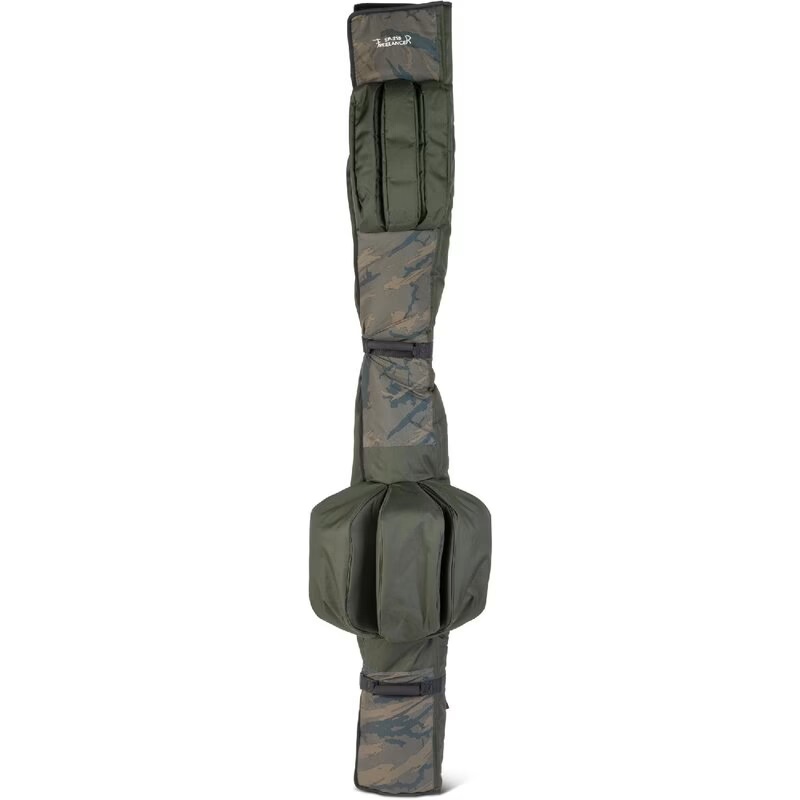 Чехол для трех оснащенных и трех не оснащенных 12 футовых карповых удилищ с мягкой подкладкой, изготовленная из оливково-зеленого полиэстера Polyester 600D. С каждой стороны, на нижнем торце, чашки для удилищ, поддерживаемые регулируемыми ремнями с липучками. Простая, но оригинальная конструкция. Имеет регулируемый ремень для переноски с толстой набивкой на плечо.