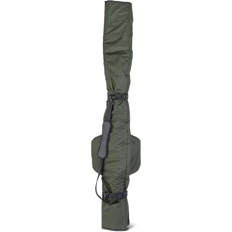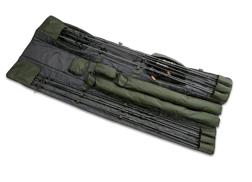 Чехол для трех оснащенных и трех не оснащенных 13 футовых карповых удилищ с мягкой подкладкой, изготовленная из оливково-зеленого полиэстера Polyester 600D. С каждой стороны, на нижнем торце, чашки для удилищ, поддерживаемые регулируемыми ремнями с липучками. Простая, но оригинальная конструкция. Имеет регулируемый ремень для переноски с толстой набивкой на плечо.