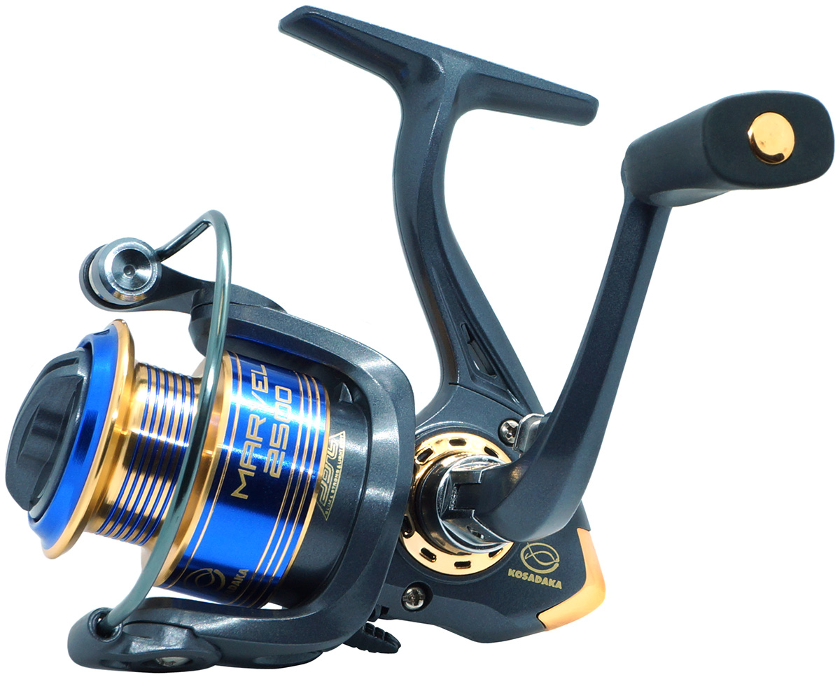 Приятный графитово-золотой дизайн катушки Kosadaka Marvel с яркой сине-золотой шпулей заметно выделяет эту катушку среди многих других моделей. Тонкий обтекаемыйоблегчённый корпус из ударопрочного графита очень практичен и приятно лежит в руке.