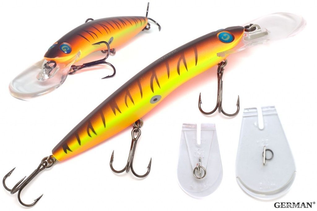 Одна из топовых линеек троллинговых воблеров воблеров от компании GERMAN. Почему топовый? потому что это одна из немногих удачных копий мирового воблера Halco SORCERER. Рекомендуемый объект ловли - щука, судак, крупный окунь, иногда сом. Поставляется с 3 сменными лопатками, 3+, 5+,8+