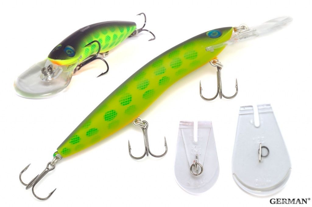 Одна из топовых линеек троллинговых воблеров воблеров от компании GERMAN. Почему топовый? потому что это одна из немногих удачных копий мирового воблера Halco SORCERER. Рекомендуемый объект ловли - щука, судак, крупный окунь, иногда сом. Поставляется с 3 сменными лопатками, 3+, 5+,8+