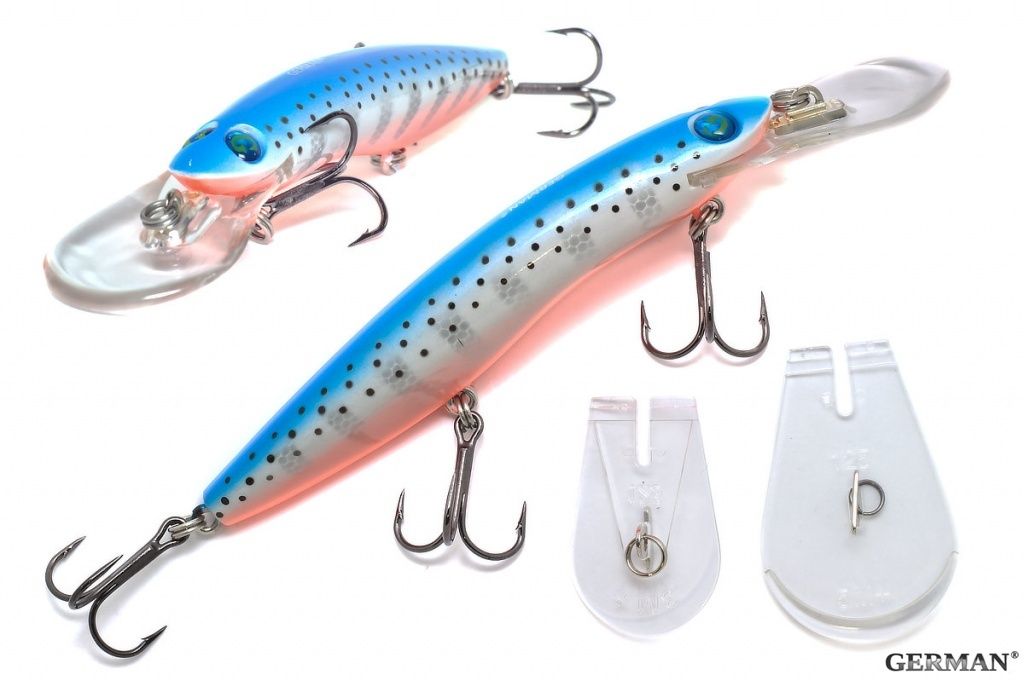 Одна из топовых линеек троллинговых воблеров воблеров от компании GERMAN. Почему топовый? потому что это одна из немногих удачных копий мирового воблера Halco SORCERER. Рекомендуемый объект ловли - щука, судак, крупный окунь, иногда сом. Поставляется с 3 сменными лопатками, 3+, 5+,8+