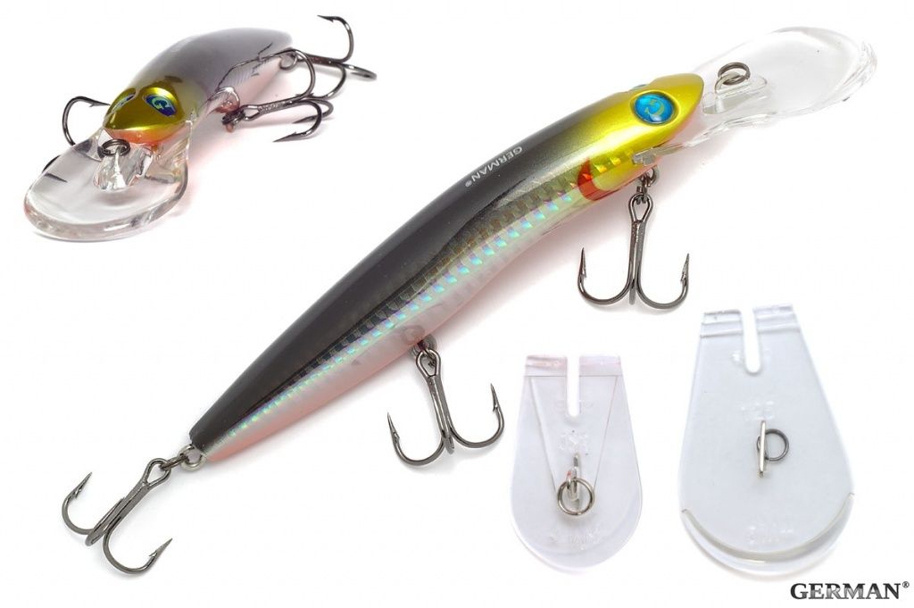 Одна из топовых линеек троллинговых воблеров воблеров от компании GERMAN. Почему топовый? потому что это одна из немногих удачных копий мирового воблера Halco SORCERER. Рекомендуемый объект ловли - щука, судак, крупный окунь, иногда сом. Поставляется с 3 сменными лопатками, 3+, 5+,8+
