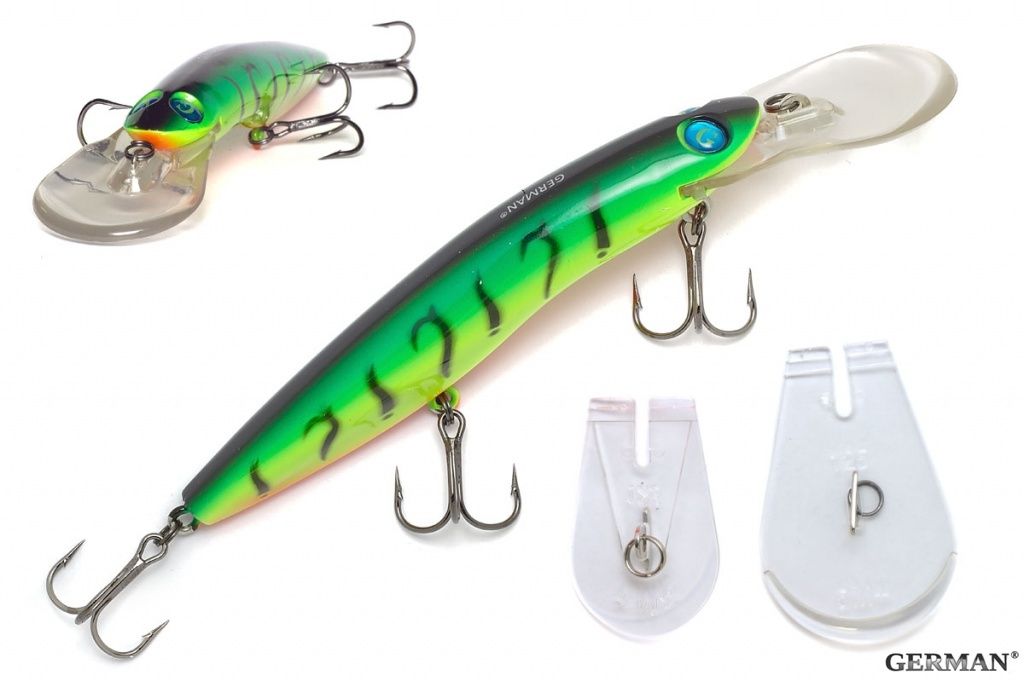 Одна из топовых линеек троллинговых воблеров воблеров от компании GERMAN. Почему топовый? потому что это одна из немногих удачных копий мирового воблера Halco SORCERER. Рекомендуемый объект ловли - щука, судак, крупный окунь, иногда сом. Поставляется с 3 сменными лопатками, 3+, 5+,8+