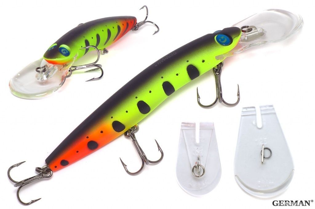 Одна из топовых линеек троллинговых воблеров воблеров от компании GERMAN. Почему топовый? потому что это одна из немногих удачных копий мирового воблера Halco SORCERER. Рекомендуемый объект ловли - щука, судак, крупный окунь, иногда сом. Поставляется с 3 сменными лопатками, 3+, 5+,8+