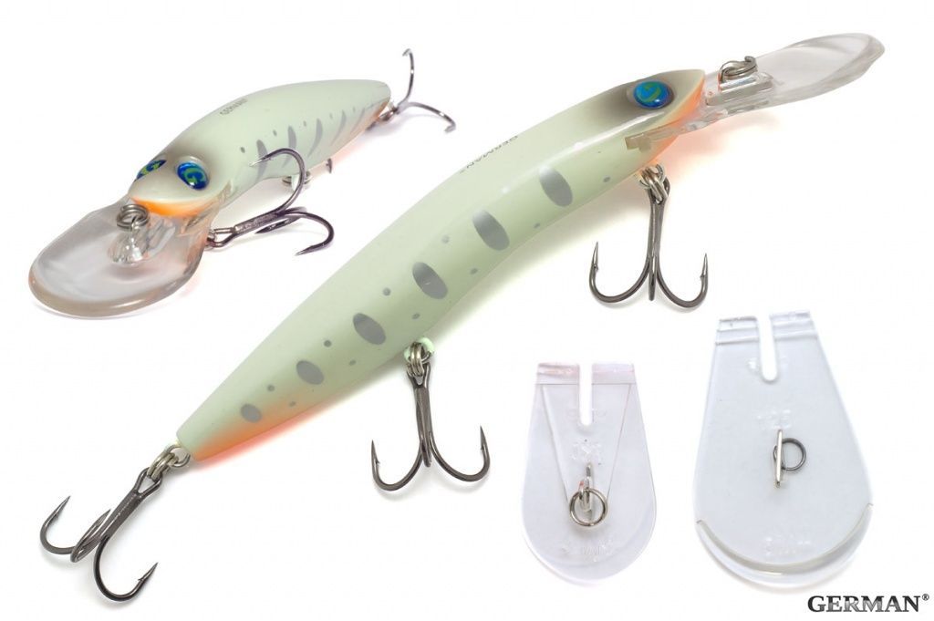 Одна из топовых линеек троллинговых воблеров воблеров от компании GERMAN. Почему топовый? потому что это одна из немногих удачных копий мирового воблера Halco SORCERER. Рекомендуемый объект ловли - щука, судак, крупный окунь, иногда сом. Поставляется с 3 сменными лопатками, 3+, 5+,8+