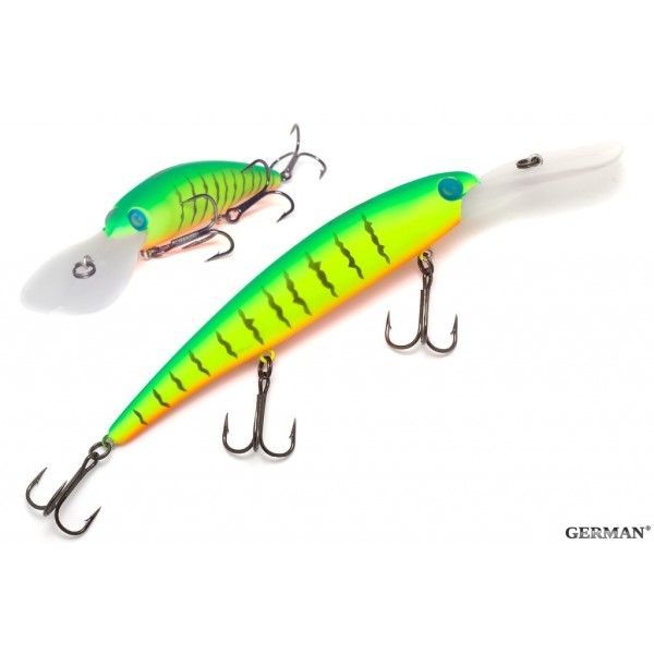 Универсальный воблер семейства минноу от компании GERMAN. Хорошо работает при троллинге,благодаря своей игре, а так же заглублению на 7-9 метров. Хорошо зарекомендовал себя среди рыболовов, благодаря своей цене, а так же результатом. Целевая рыба - щука, судак, крупный окунь