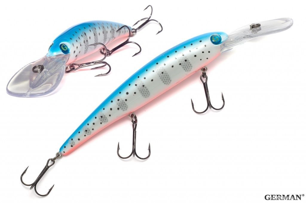 Универсальный воблер семейства минноу от компании GERMAN. Хорошо работает при троллинге,благодаря своей игре, а так же заглублению на 7-9 метров. Хорошо зарекомендовал себя среди рыболовов, благодаря своей цене, а так же результатом. Целевая рыба - щука, судак, крупный окунь