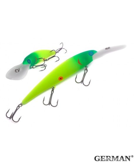 Универсальный воблер семейства минноу от компании GERMAN. Хорошо работает при троллинге,благодаря своей игре, а так же заглублению на 7-9 метров. Хорошо зарекомендовал себя среди рыболовов, благодаря своей цене, а так же результатом. Целевая рыба - щука, судак, крупный окунь
